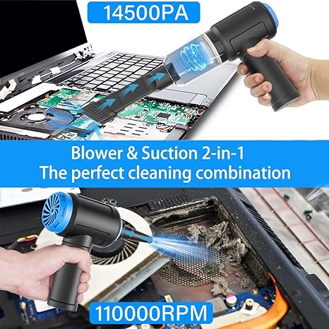 - Multiple accessories for different occasions:The accessories of this PC cleaner have at least 6 combinations, which can be used as keyboard cleaner, car interior cleaner. It can not only solve the dirt in hard-to-reach places, but also work on crevices or camera lens.(The blow nozzle and flexible hose are packed together, please don't miss it when you open the package).