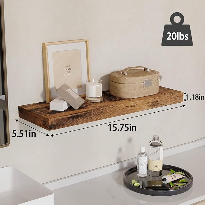 Fixwal 15.8in Wall Shelves, Rustic Wood Finish Floating Shelves Set of 4, Shelves for Wall Decor, with Invisible Brackets for Bathroom, Living Room,Bedroom and Kitchen(Rustic Brown) | Wall Shelves, for Bathroom, Living Room, Bedroom, Kitchen