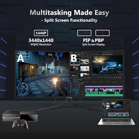 - Split Screen: Unleash the power of crystal-clear visuals with a stunning 3440x1440 resolution. Our monitor brings your games and multimedia to life with sharp details and vibrant colors. Boost your productivity and gaming enjoyment with split-screen functionality. Effortlessly manage multiple applications or keep an eye on in-game strategies without missing a beat.