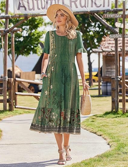 Zeagoo Womens Summer Dresses 2026 Casual Midi Dress Flowy Sundress Ruffle Short Sleeve Tiered Dresses A Line Boho Dress