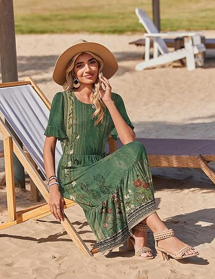 - ăFeaturesă: The Stunning Long Dress with Charming Ruffle Short Sleeves, Crew Neck, Loose Fit, Elastic High Waist Dress, Solid and Printed Colors, Pleated Skirt, And Flowing Tiered Boho Dress, While the Two Pockets Add Practicality to This Casual Dress. A Line Dress; Beach Dress; Boho Sun Dresses For Women.