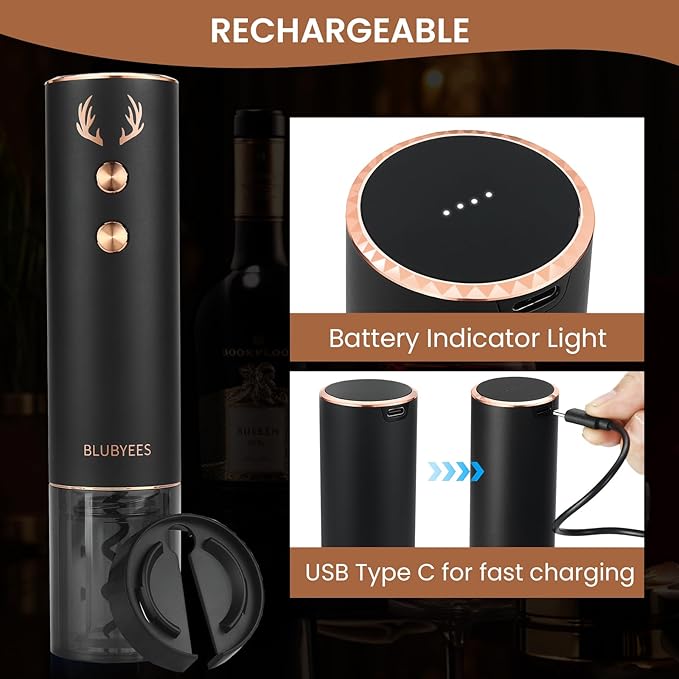 - Luxurious Design - The matte black body with a golden antler pattern gives this electric bottle opener a unique and elegant style. A transparent window allows for easy observation of the corkscrew's operation, while round buttons on both sides control the smooth up-and-down motion. The clear bottom part is designed for effortless cleaning and maintenance