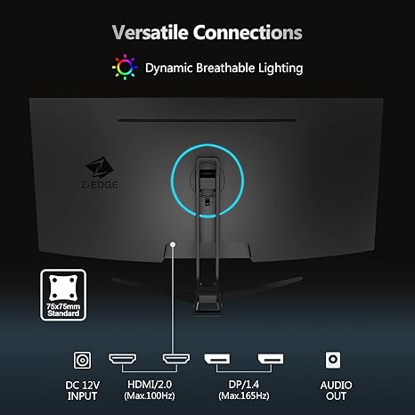 Z-Edge 34" Curved Gaming Monitor, WQHD 1440P 165Hz 144Hz PC Monitor, MPRT 1ms, 21:9 Aspect Ratio, 1500R, 16.7M Colors, 3000:1 Contrast, UG34 Frameless Bezel, 2X DP 1.4 Ports and 2X HDMI 2.0 Port
